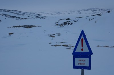 On our route to Haukeliseter we had to pass Norway’s largest rockfill dam. It is 90 meters high and a staggering 1.4 kilometres wide (!). The total mass of the dam consists of 9.7 million cubic meters of rockfill. The whole thing, with all the powerlines running besides it, makes it look like some kind of troll prison.