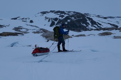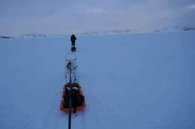 The dam, together with 13 other, houses the lake Blåsjø. The lake is both the largest hydro energy storage and the largest artificial lake in Norway. On our route, we had to cross it, which took us a couple of hours. The route over the lake has been marked out with stakes, so that one avoids going near any of the inlet tunnels that feeds the power plants or any other parts of the lake that might be unsafe. Many of the DNT cabins around the lake have charts that show the unsafe parts of the lake, so there are plenty of possibilities to go around freely on the ice. One just needs to take care when entering the ice near the shoreline, since there usually will be big cracks in the ice because of the changing water level.