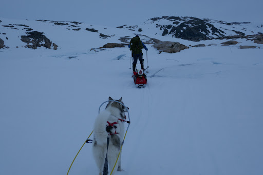 The dam, together with 13 other, houses the lake Blåsjø. The lake is both the largest hydro energy storage and the largest artificial lake in Norway. On our route, we had to cross it, which took us a couple of hours. The route over the lake has been marked out with stakes, so that one avoids going near any of the inlet tunnels that feeds the power plants or any other parts of the lake that might be unsafe. Many of the DNT cabins around the lake have charts that show the unsafe parts of the lake, so there are plenty of possibilities to go around freely on the ice. One just needs to take care when entering the ice near the shoreline, since there usually will be big cracks in the ice because of the changing water level.