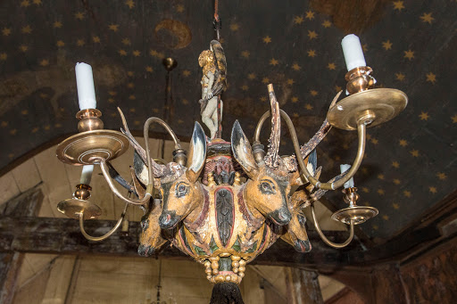 | The chandelier is from Germany and has the half naked goddess Fortuna on top |