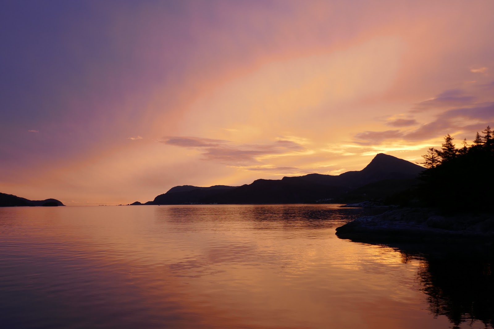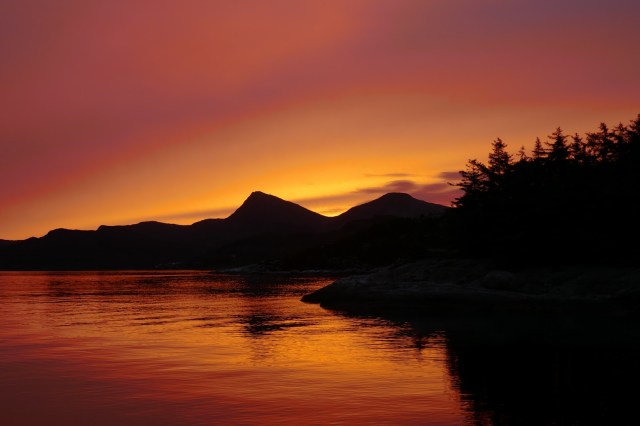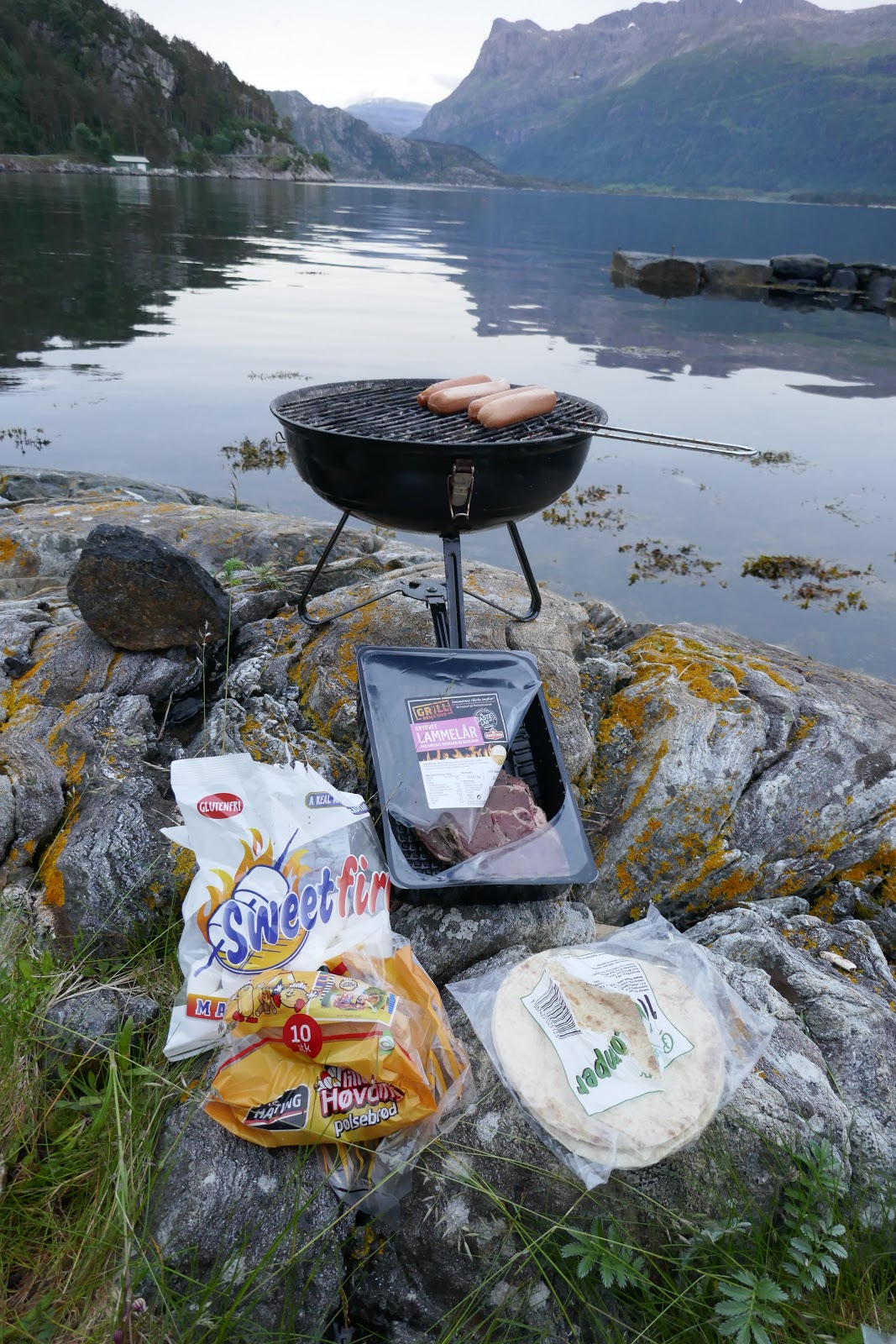 It’s the longest day of the year and we have made camp a few kilometers from the city of Måløy. At this camp spot we met some very nice people that where barbecuing and celebrating the summer solstice. They were about to leave when we came ashore, but they told us that we could use their barbecue and eat the food that they had left! How nice people are! We enjoyed a couple of sausages and lamb chops, before we watched an amazing sunset.