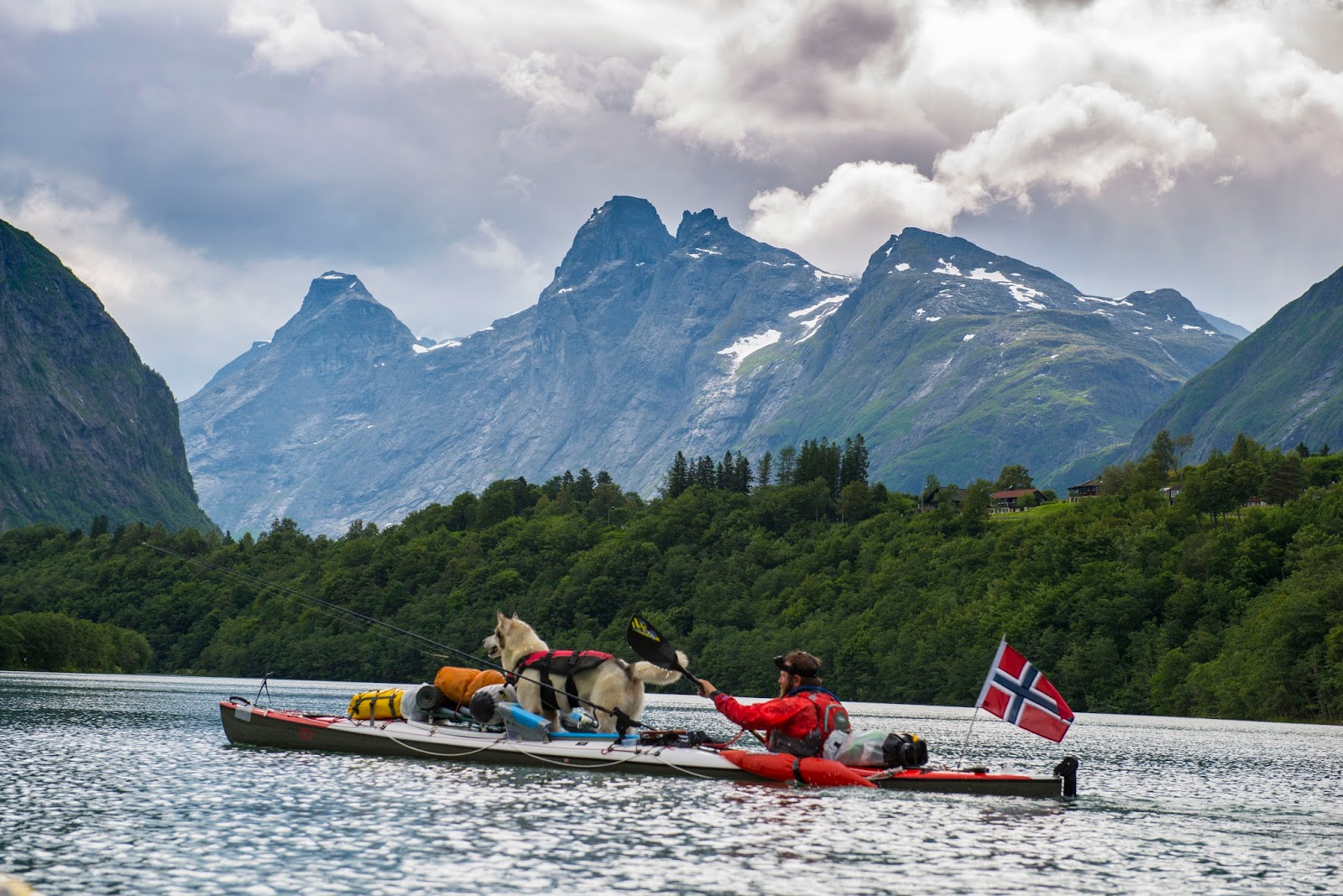 | Paddling upstream, with the mountain peaks Bispen (the bishop), Kongen (the king) and Dronninga (The Queen) in the back |