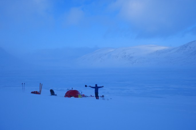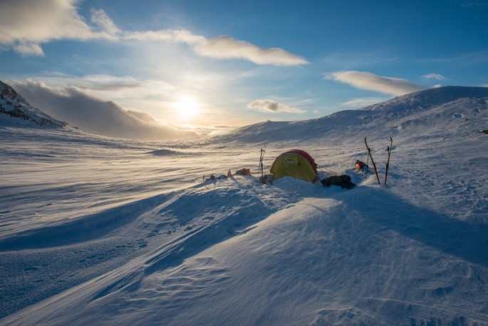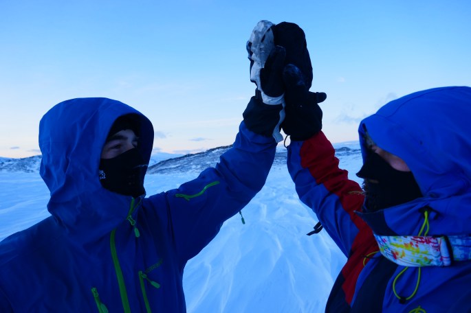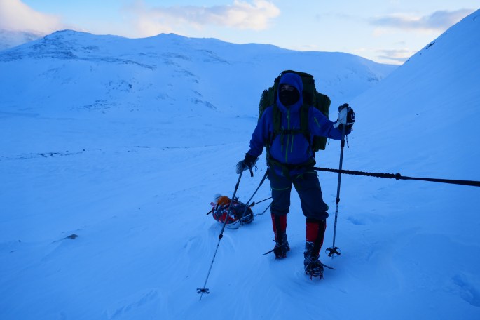 Most people who are crossing the length of Norway at this time of year, usually take the route via Sweden, bypassing the entire bit of Norwegian terrain between Sulitjelma and Narvik. The reason is simple, even in the summer, staying on the Norwegian side of the border is a big challenge because of the difficult terrain. Doing it in the middle of the winter is an even harder and downright dangerous undertaking. Going up and down steep summits that sometimes are at a 45-degree angle, is a death wish in regard to avalanches and other safety issues. Adding to the difficulty, we have with us 200 kg of equipment and supplies for 30 days that we have to get through this terrain. This is truly a manhood challenge from hell. Lucky for us, the winter has been bad in regard to the amount of snow, so the avalanche danger is almost non-exciting at this point.
