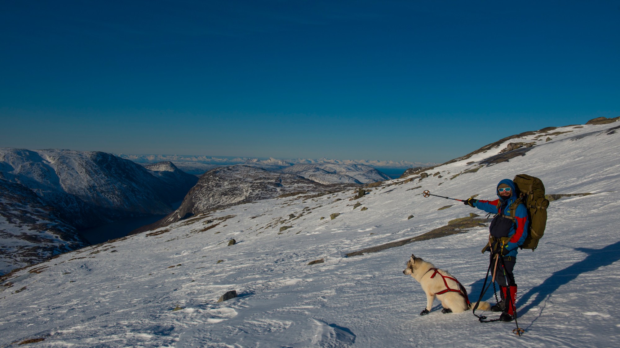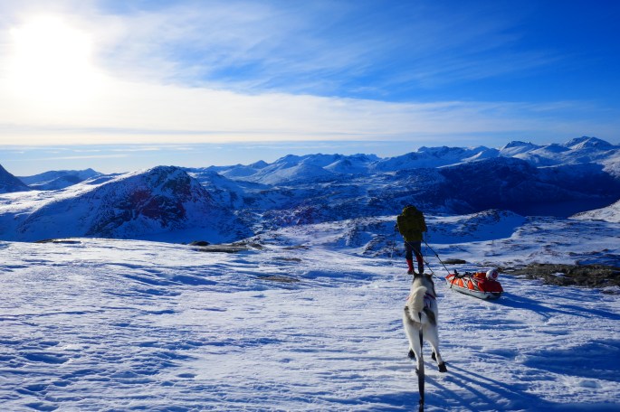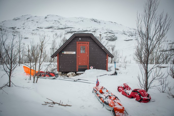 We have now arrived at a place called Sørfjorden. This is 2/3 through this hard leg of our journey and we have arranged to have a resupply of food here. As luck would have it, a Norwegian power Company (Nordkraft) is building a windmill park here, and they were more than happy to help us transporting our supplies to this remote place. Not only that, today we can celebrate being 1 year on our trip! So, we also kindly asked the people from the power company to buy some fresh food and extra snacks for us to celebrate this occasion. At this place there is also a small and cosy hut where we will stay a few days before continuing.