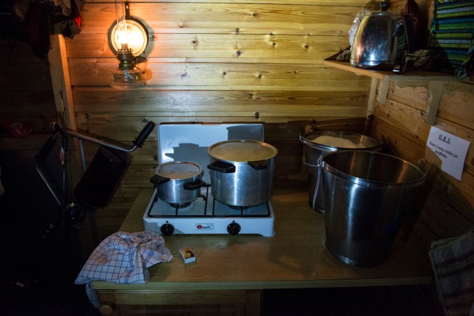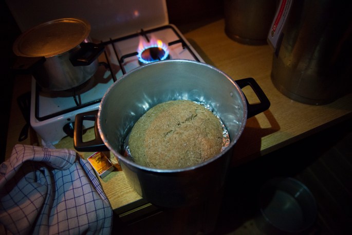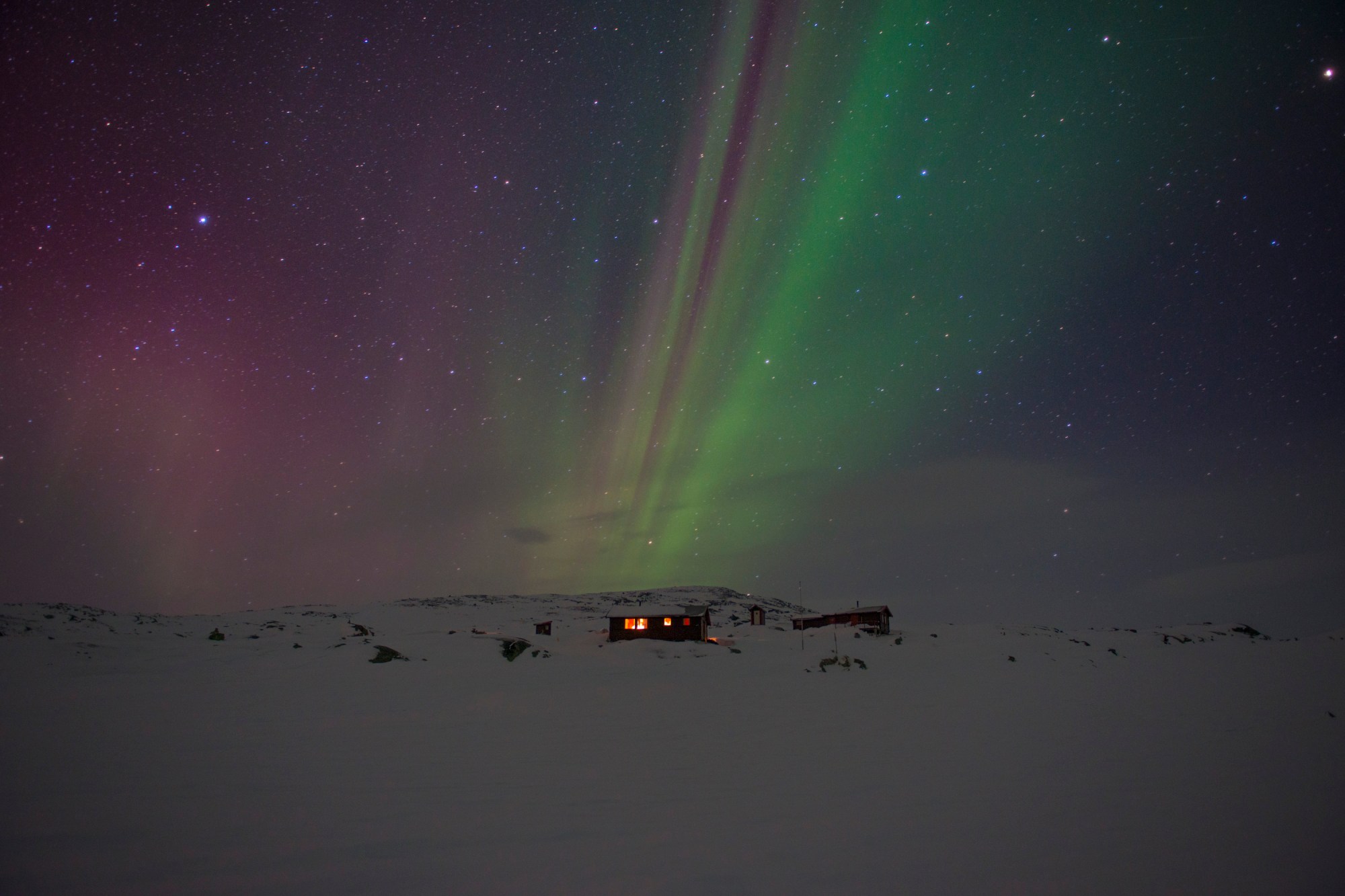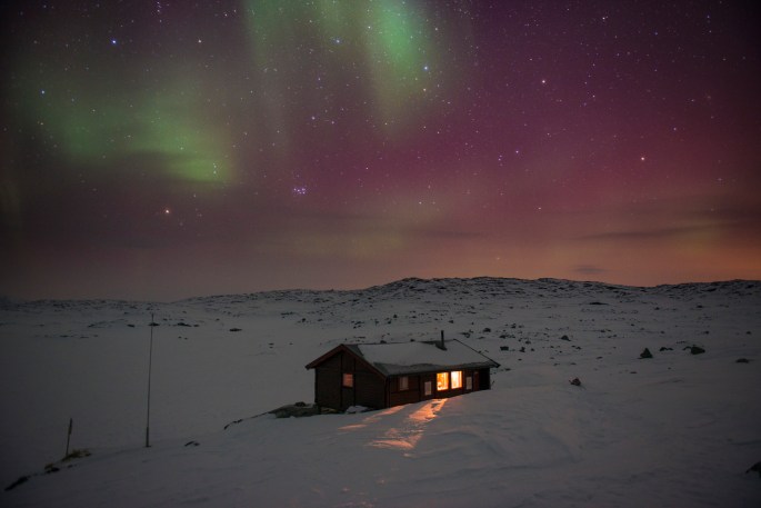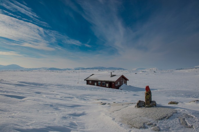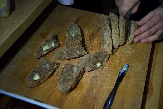 After many days of difficult terrain, taking the long route rather than the shortcuts, just to avoid the Swedish border, we arrived at Skoaddejávri late at night. This is as DNT cabin that sits at 1002 meters above sea level and has a nice view all around. From here you can see right in to Sweden and admire some of the mountains that they have there. Since we have been on the move for so many days now, we decided to take a 3-days rest here to regain our strength. A small lake is situated right in front of the cabin, where there should be good fishing. Anders therefor took some time doing some ice fishing and me and Jan took a short hike to the mountain peak right behind the cabin. These cabins are well equipped, but they do not have an oven. But with some ingenuity, we made homemade bread each night and nothing beats freshly baked bread with A LOT of butter!